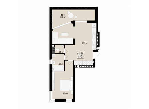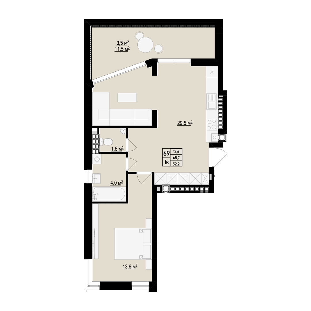 Планування 1-кімнатної квартири в будинку на вул. Бігова, 19 (1 секція) — №69