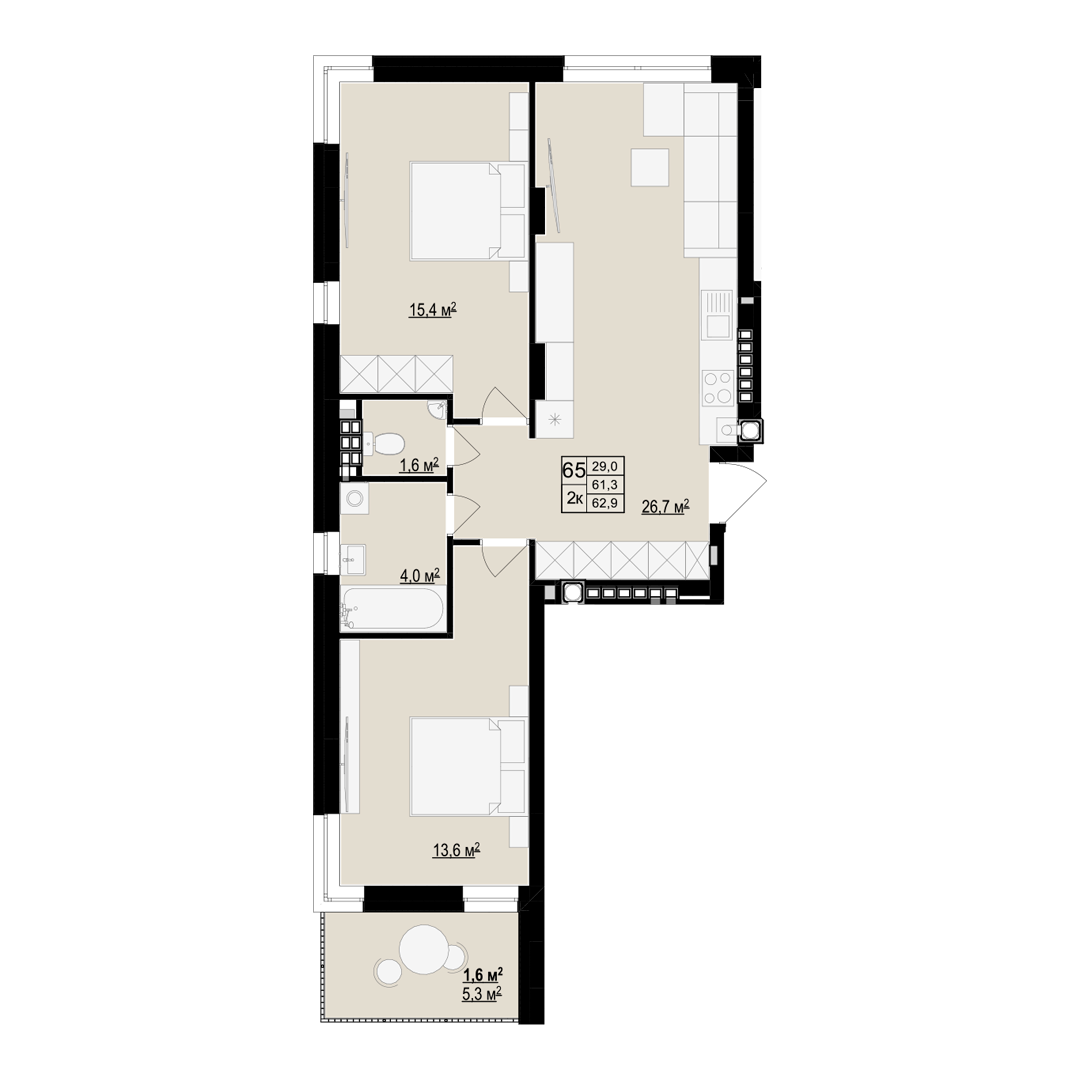 Планування 2-кімнатної квартири в будинку на вул. Бігова, 19 (1 секція) — №65