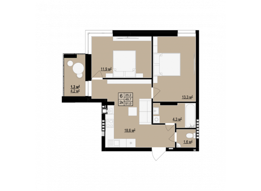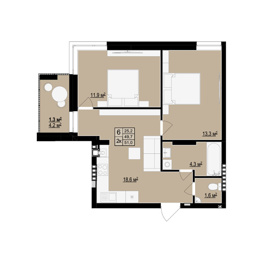 Планування 2-кімнатної квартири в будинку на вул. Бігова, 19 (4 секція) — №6