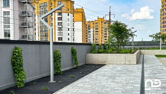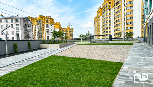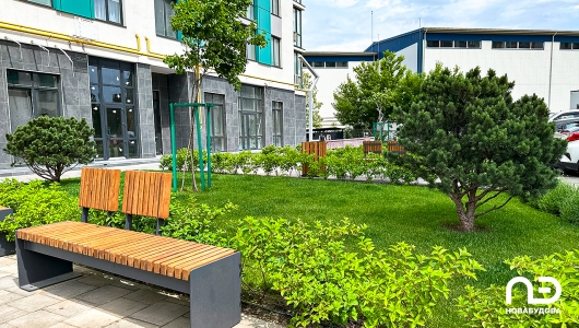 У другій черзі (вул. Оксамитова, 11-А) завершено висадку квітів і газону, змонтовано систему поливу. Триває підготовка до монтажу дитячого майданчика.