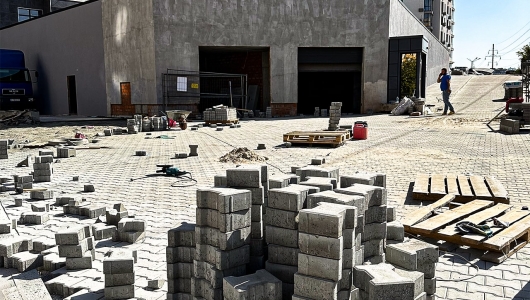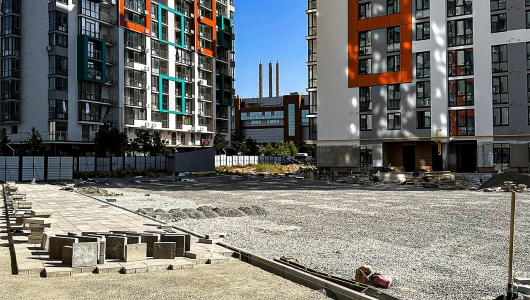 У другій черзі (вул. Оксамитова, 11-А) тривають роботи з підключення мереж електропостачання й підготовка до озеленення прибудинкової території. Завершено облаштування підпірних стін і роботи з мощення проїздів.