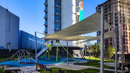 У другій черзі (вул. Оксамитова, 11-А) повністю завершено внутрішнє оздоблення, облаштування підвісних стель, монтаж світильників, пожежних датчиків. Триває оздоблення холу, який готовий на 30%. Також майстри працюють над облаштуванням прибудинкової території.