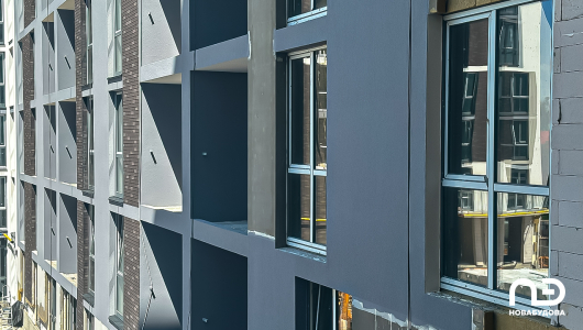 У третій секції тривають роботи з монтажу віконних конструкцій, зведення стін і міжквартирних перегородок, облаштування сантехнічних мереж, підготовка до фасадних робіт.