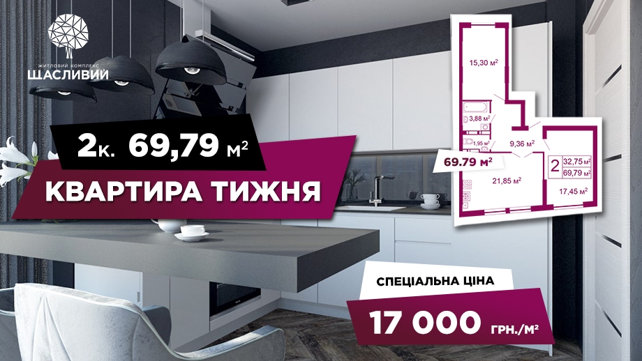 Компанія «НоваБудова» презентує нову вигідну пропозицію в розділі «Квартира тижня» – двокімнатну квартиру в готовому будинку ЖК «Щасливий» на Софіївській Борщагівці (вул. Яблунева, 11) за ціною 17 000 грн/кв. м.