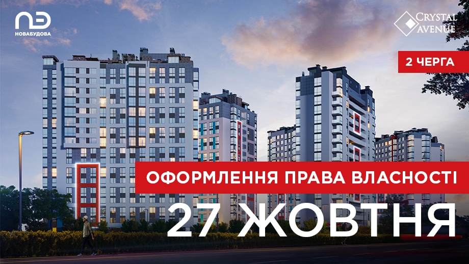 А вже 27 жовтня розпочнеться оформлення права власності на квартири в цьому будинку, а з 31 жовтня – видача ключів. Це означає, що представники компанії «НоваБудова» будуть зв’язуватися із усіма мешканцями, які придбали житло в ІІ черзі ЖК, для підписання основних договорів та вручення прав власності й ключів. Право власності надається в порядку черговості: хто придбав квартиру першим, той і набуде спочатку у власність свою нерухомість у ІІ черзі ЖК «Crystal Avenue».